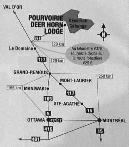 Prendre la route 117 jusqu’au kilomètre 374 dans la réserve La Vérendrye, prendre le chemin #29E pour 29 kilomètres.